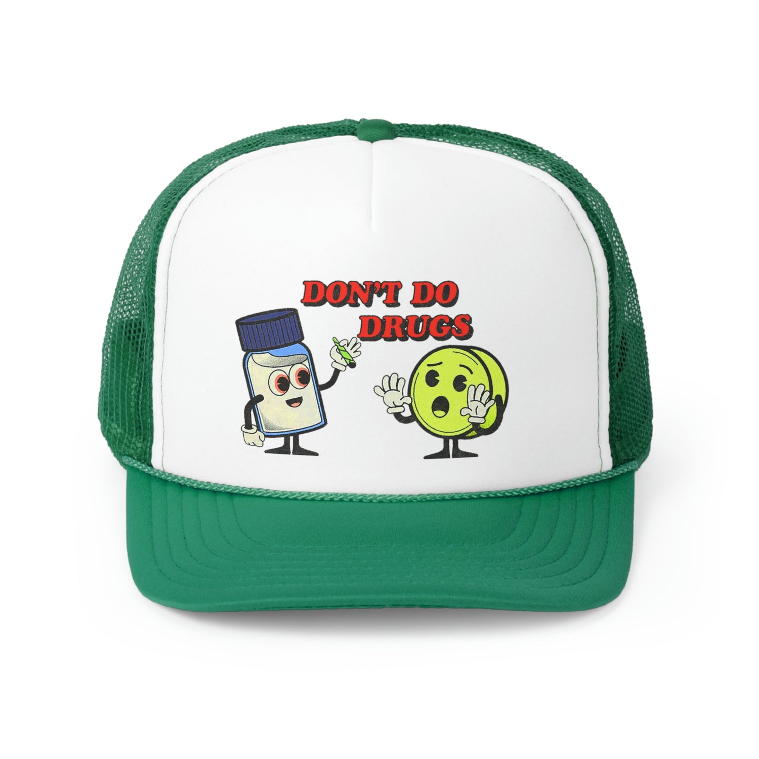 Don't do drugs, em'kay? 100% polyester front, 100% nylon mesh weave back, this baby is super durable.