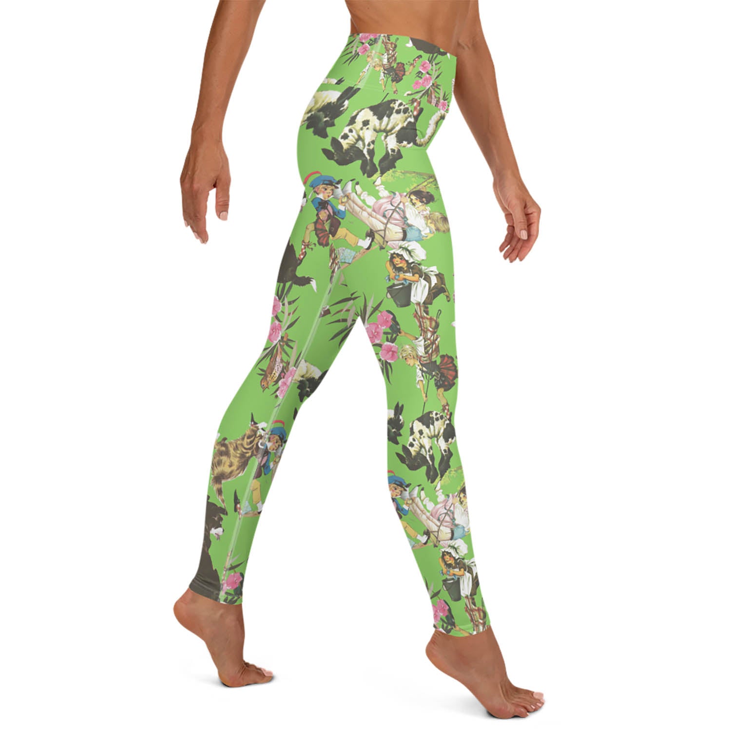 Nursery Rhyme Collage High Waisted Workout Leggings in Lime Green
